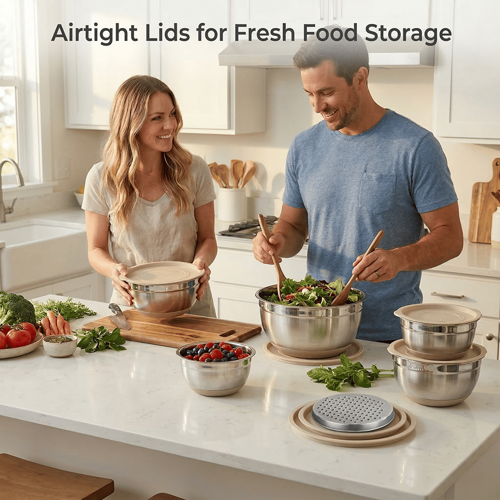 The included food-grade plastic lids fit tightly onto each bowl, creating an airtight seal that helps keep food fresh. This makes the bowls ideal for storing leftovers, preparing ingredients in advance, or keeping salads and snacks ready in the refrigerator.