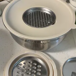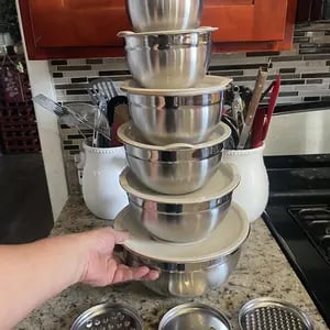 This 6-piece stainless steel nesting mixing bowl set is designed to bring convenience and efficiency to your kitchen. Each bowl is made from high-quality food-grade stainless steel, offering excellent durability and resistance to rust or dents. The set also includes airtight lids and three interchangeable graters, allowing you to grate, slice, mix, and store ingredients all in one place.