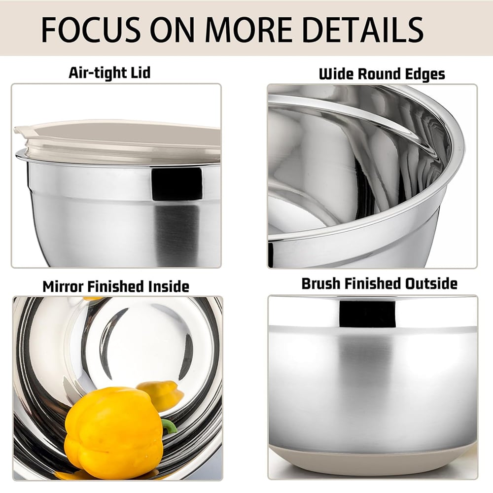 Each bowl features a non-slip silicone bottom that keeps it steady while mixing, whisking, or stirring ingredients. This design prevents sliding on kitchen countertops and makes food preparation safer and more comfortable.