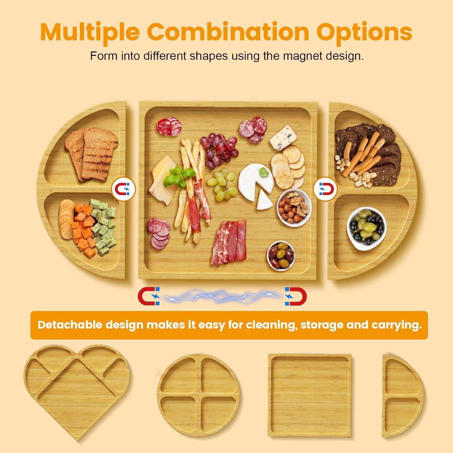 Unlike traditional boards, this set features strong magnetic connectors that allow the boards to combine into one extended serving surface.