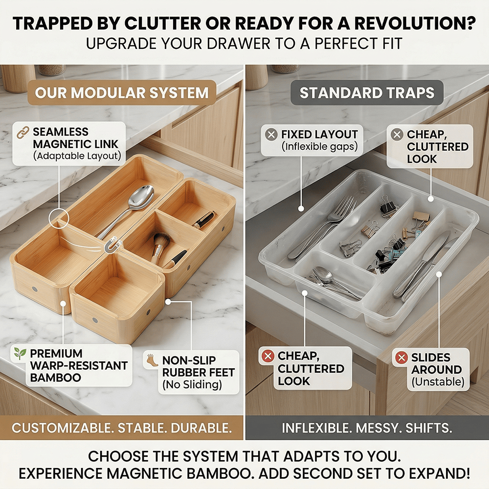 Bring calm and order back into your home with this beautifully crafted bamboo organizer set — designed for flexibility, durability, and effortless organization. ✨