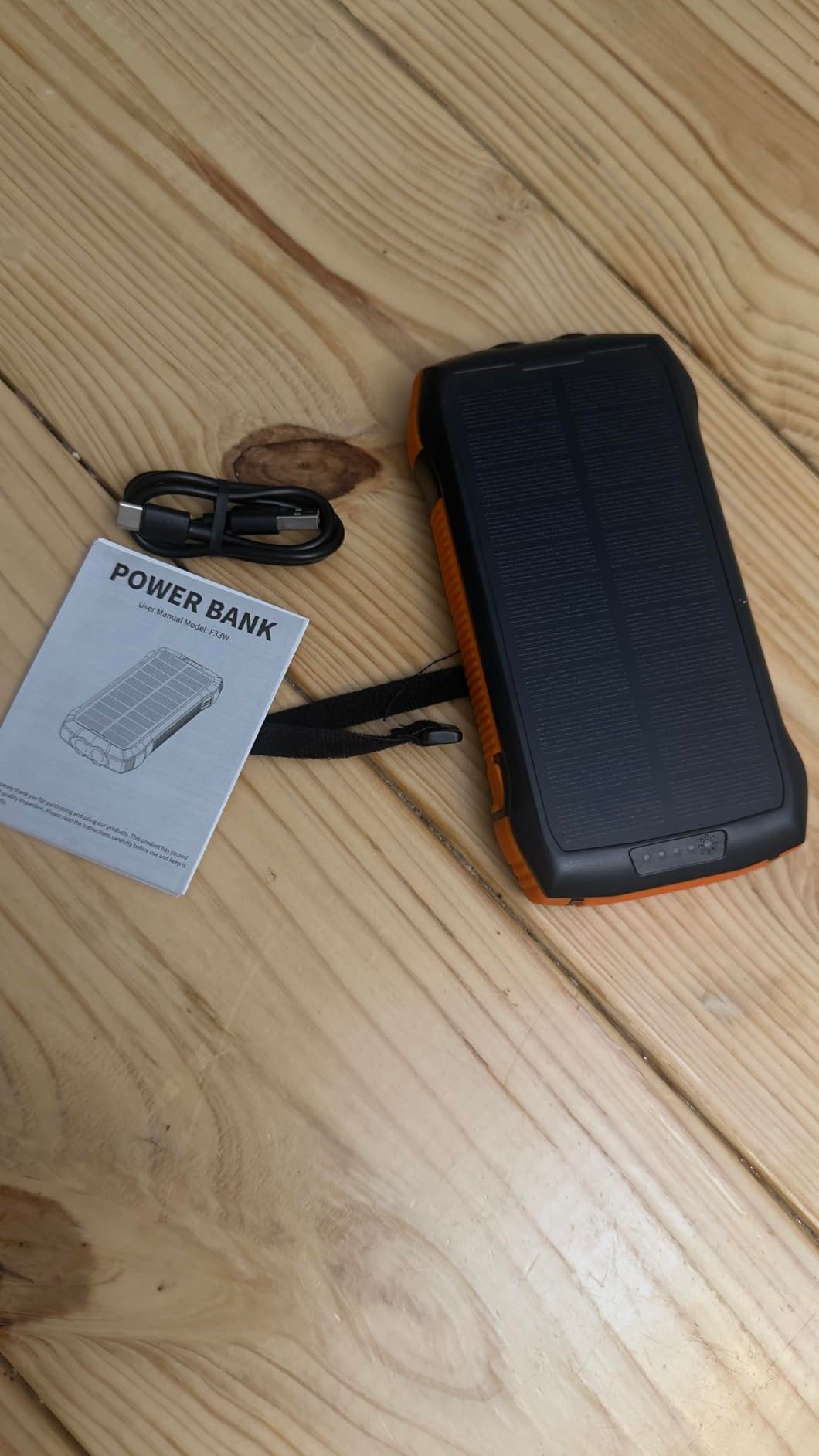 Charging the Power Bank - Use the included USB-C cable to connect the power bank to a wall charger, laptop, or other power source. The LED indicator will light up to show charging progress. - For emergency solar charging: Place the power bank in direct sunlight, ensuring the solar panel is fully exposed. Note that solar charging is slow and should only be used as a backup.